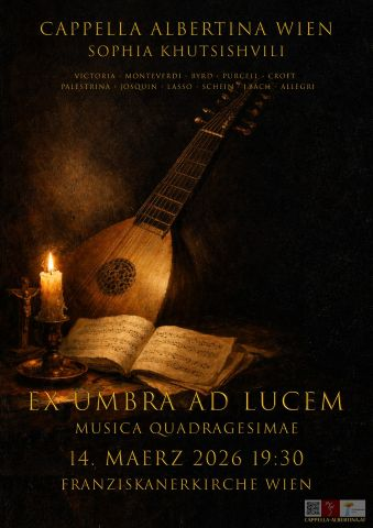 14. März 2026, 19.30 Uhr, Franziskanerkirche, Wien 1, Franziskanerplatz 4: Ex Umbra ad Lucem, Cappella Albertina Wien, Sophia Khutsishvili, Leitung. Richard Labschütz, Laute (H. Gerle, C. Neusidler, M. Fuenllana, Ph.Hainburger Lautenbuch, E. Reusner d. Ä.)