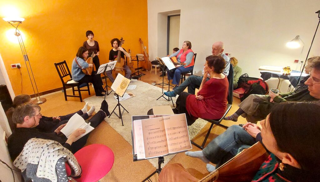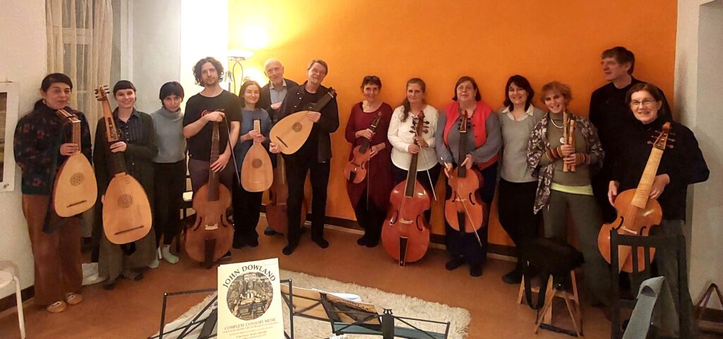 Der 400. Todestag* von John Dowland war Anlass diesen zu feiern, seiner zu gedenken und seine Musik erklingen zu lassen. Gemäß der Musizierpraxis seiner Zeit trafen sich unterschiedliche Musiker und Musikerinnen in kleinem Rahmen. Es war ein gelungener Mix aus Hobbymusiker*innen und jungen Studierenden der Privatuniversität MUK, Wien, darunter einige Lautenist*innen von Prof. David Bergmüller. Das Feldenkraisstudio von Elisabeth Labschütz in der Sigmundsgasse im 7. Bezirk in Wien bot einen guten Rahmen für Gambist*innen, Lautenist*innen und Sänger*innen. Gamben und Gesang in einem Raum, die Laute-Spielenden in einem 2. Raum, erarbeiteten Dowlands Lachrimae1 und 2 sowie einige Consortsongs und Instrumentalstücke. Nach einer kleinen Pause trafen wir uns gemeinsam in einem Raum, um miteinander klangliche Kombinationen auszuprobieren und kleinen vorbereiteten Darbietungen Raum zu geben.